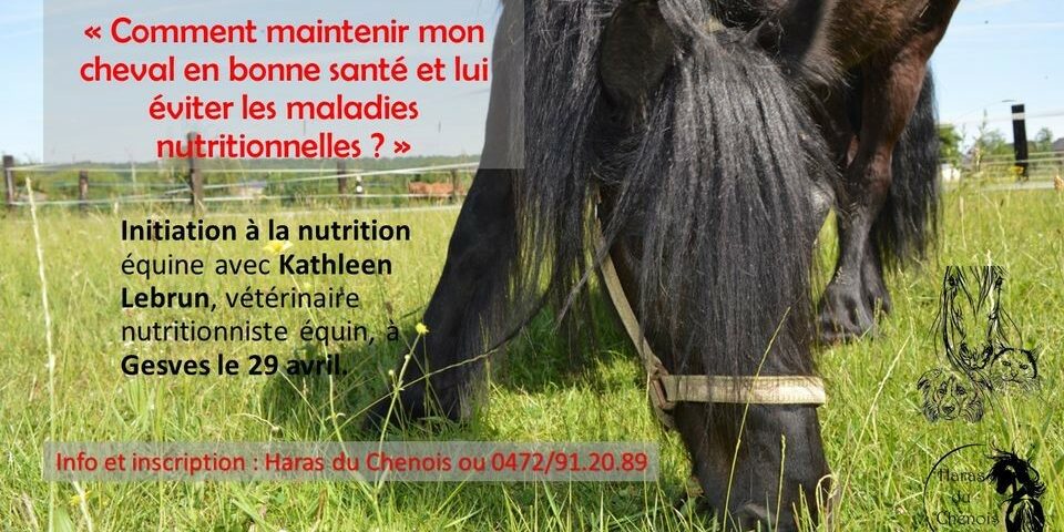 29/04/23 Initiation à la nutrition : Alternanutrivet ( kathleen lebrun – Vétérinaire nutritionniste spécialisée en soin alternatif) Info et inscription : Haras du Chenois : 0472/91.20.89