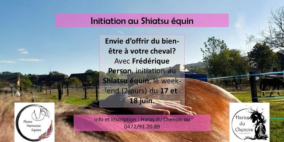 17 et 18/06/23 Initiation au Shiatsu équin : Plume Harmonie Equine (Frédérique Person – praticienne shiatsu et professeur chez Kink’Uma, Ecole de Shiatsu équin) Info et inscription: Hara du Chenois: 0472/91.20.89