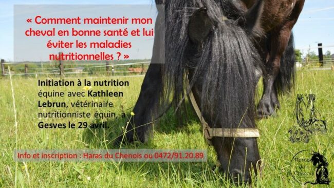 29/04/23 Initiation à la nutrition : Alternanutrivet ( kathleen lebrun – Vétérinaire nutritionniste spécialisée en soin alternatif) Info et inscription : Haras du Chenois : 0472/91.20.89