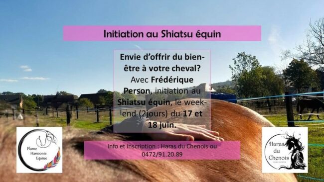 17 et 18/06/23 Initiation au Shiatsu équin : Plume Harmonie Equine (Frédérique Person – praticienne shiatsu et professeur chez Kink’Uma, Ecole de Shiatsu équin) Info et inscription: Hara du Chenois: 0472/91.20.89
